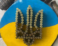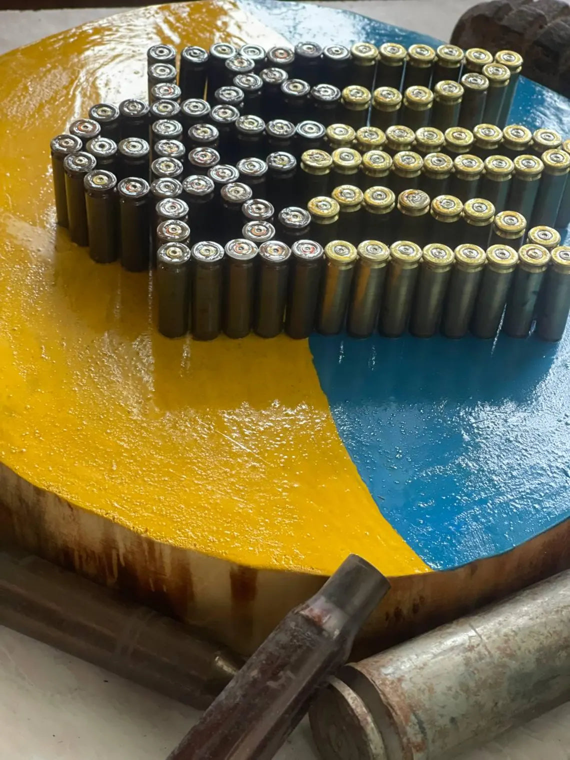 This striking Ukrainian Trident emblem is handcrafted from decommissioned brass shell pieces, carefully assembled over a 30 cm wood slice, hand-painted in blue and yellow tones.